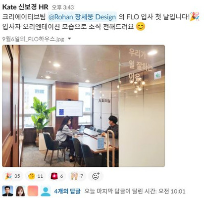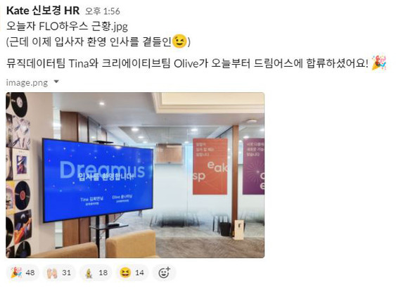 리모트워크 중인 구성원들도 새로 합류한 입사자에게 환영의 마음을 전할 수 있도록 소식을 공유하고 있습니다 😊