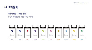드림어스컴퍼니가 지향하는 조직 문화, 사내 제도, 근무 방식, 복리 후생, 평가와 보상은 어떻게 이루어지는 등 회사에 대해 전반적으로 안내드리는 내용으로 구성되어있습니다.